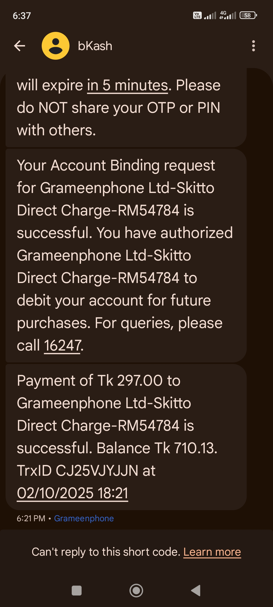 Payment of Tk 599.00 to Grameenphone Ltd-Skitto Direct Charge-RM54784 is successful. Balance Tk 8.93. TrxID CIJ0IQ9QRY at 19/09/2025 02:26